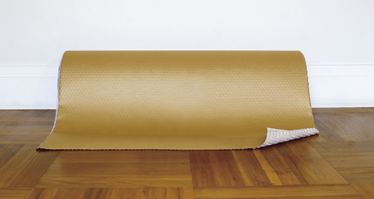 É feito de papel Kraft impermeável e plástico bolha de alta resistência (5x mais que o comum). Assim, vai proteger o chão dos  líquidos dos objetos que o poderiam estragar.