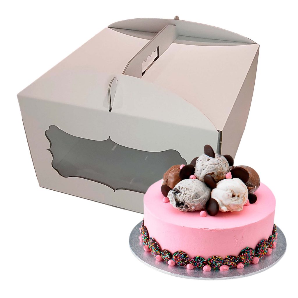 Caixa Cartão Pastelaria Branco c/Pega c/ Janela Vintage 34x34x20cm c/ Impressão