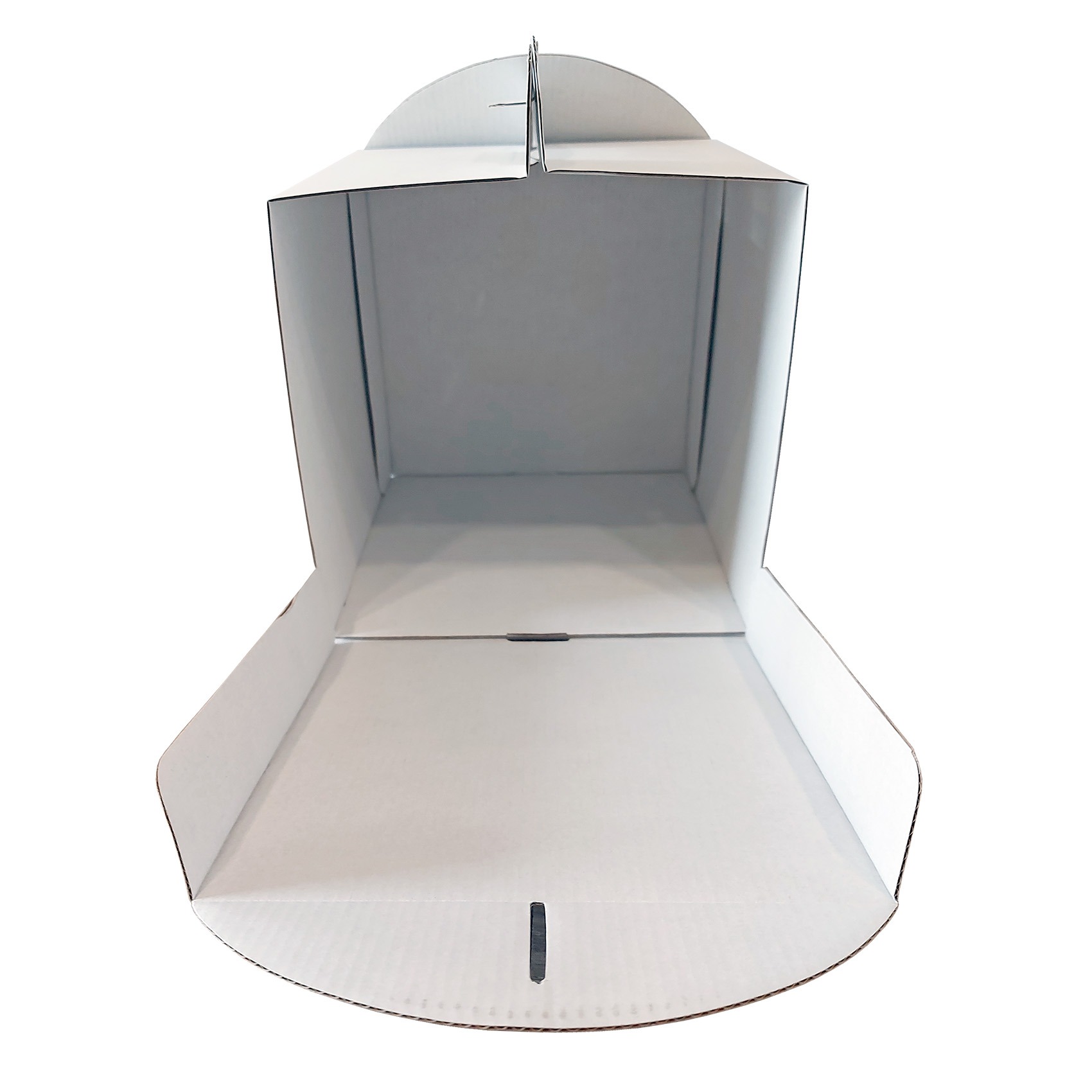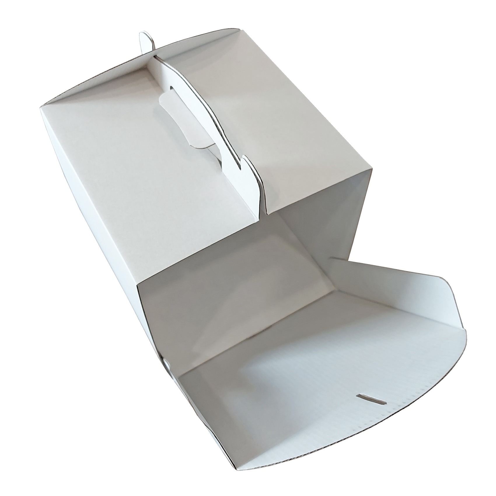 Caixa de cartão para bolos com pega e sem janela, na cor branca, destinada a transporte de bolos, nomeadamente de aniversários, ocasiões especiais etc.