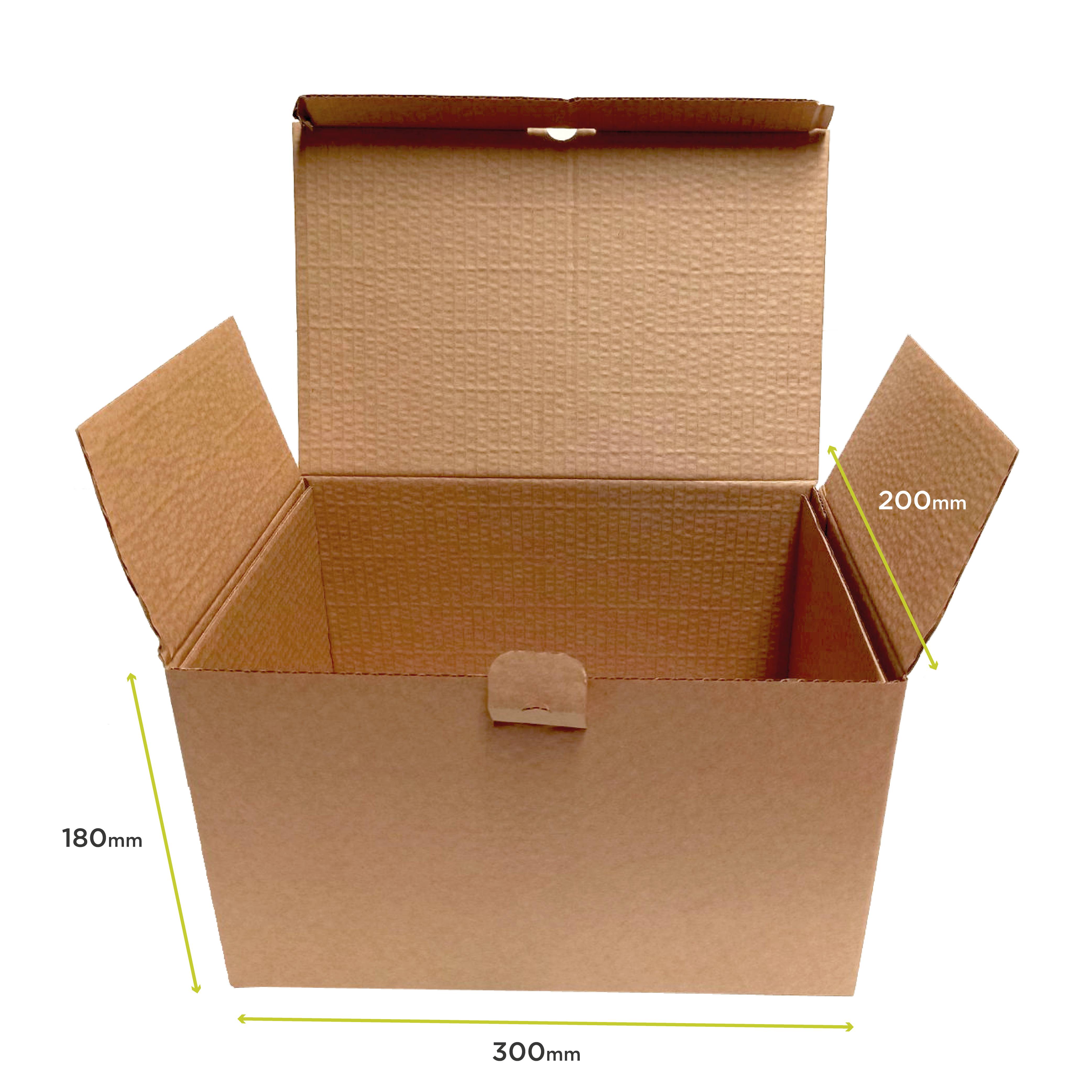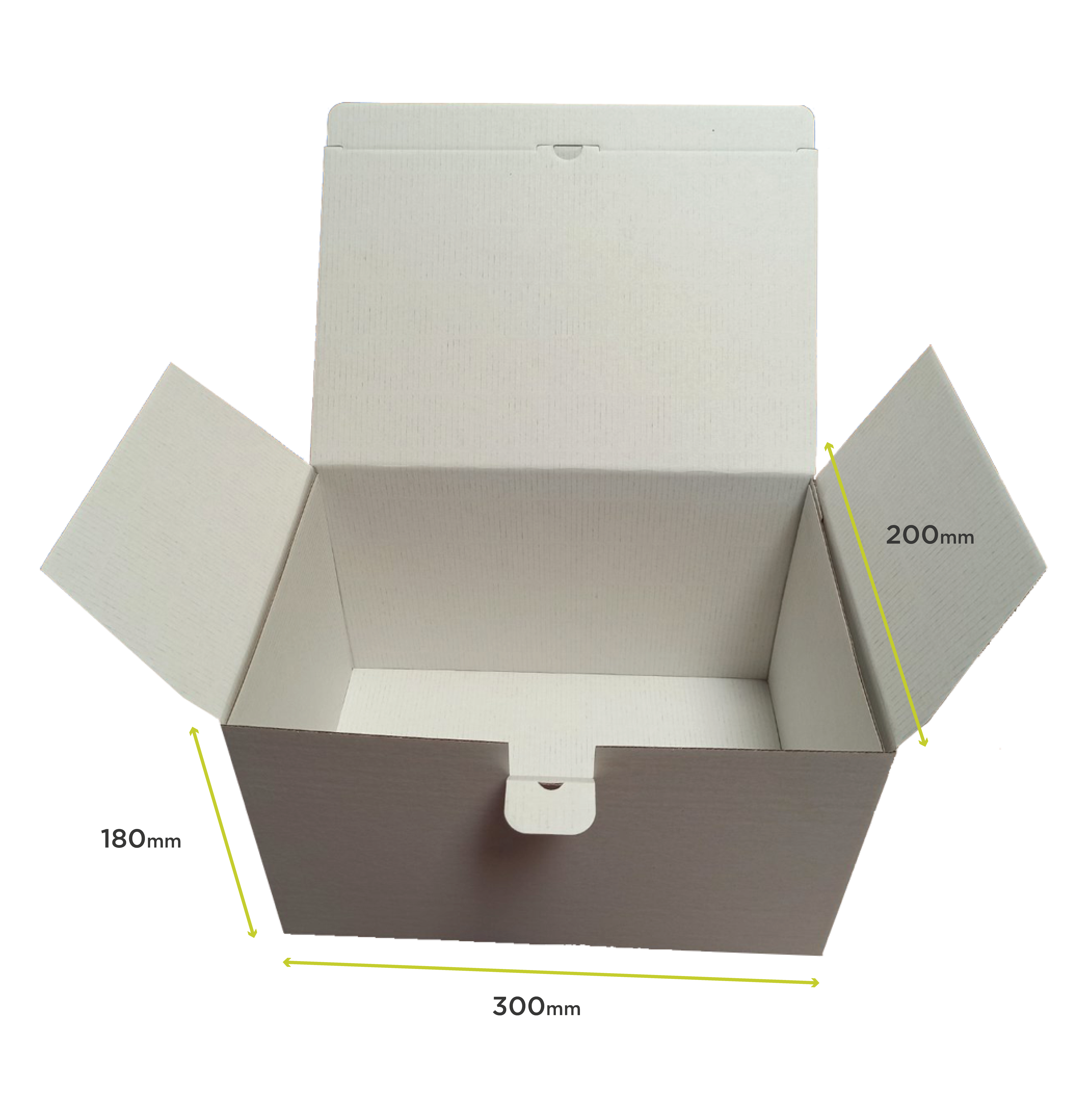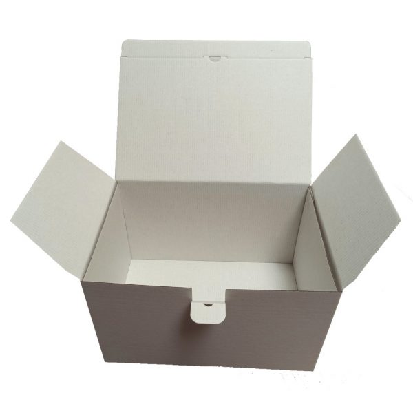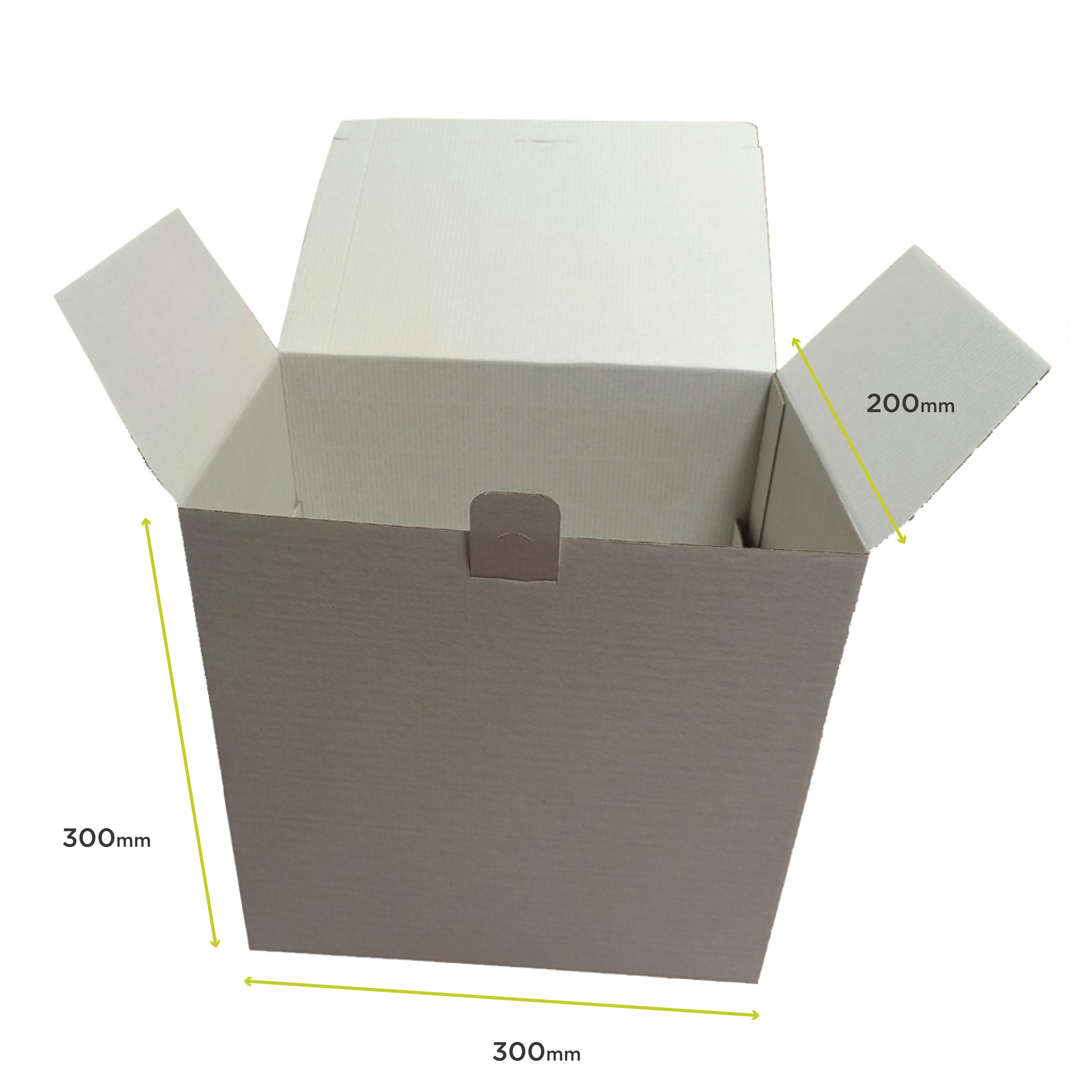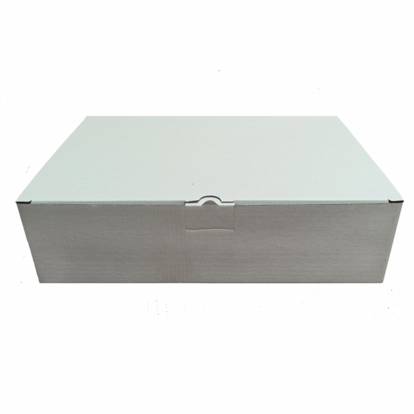 Caixa de expedição em cartão reciclado branco com reforço no fundo.