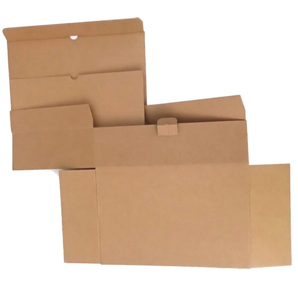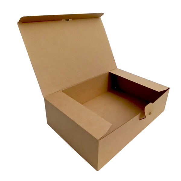 Caixa de expedição em cartão reciclado branco com reforço no fundo.