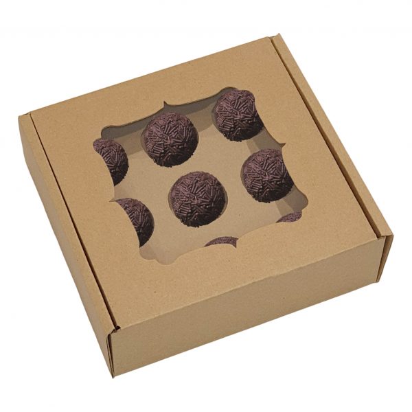 Caixa Cartão Kraft 140x140x50mm p/ transporte 9 brigadeiros c/ janela