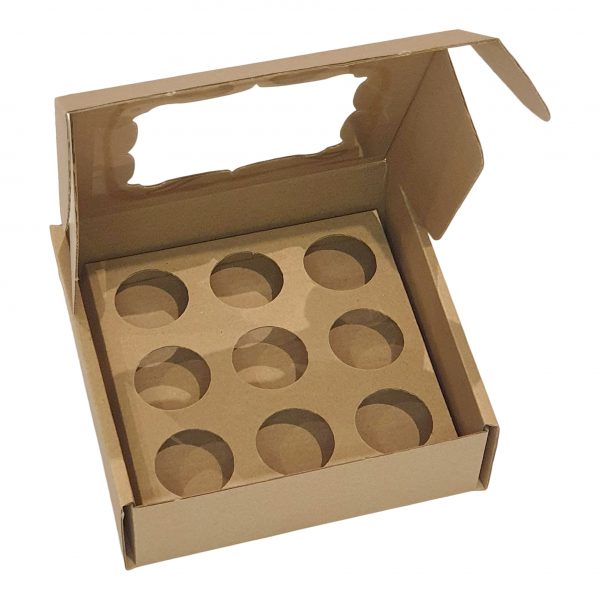 Início Caixa Cartão Kraft 140x140x50mm p/ transporte 9 brigadeiros c/ janela