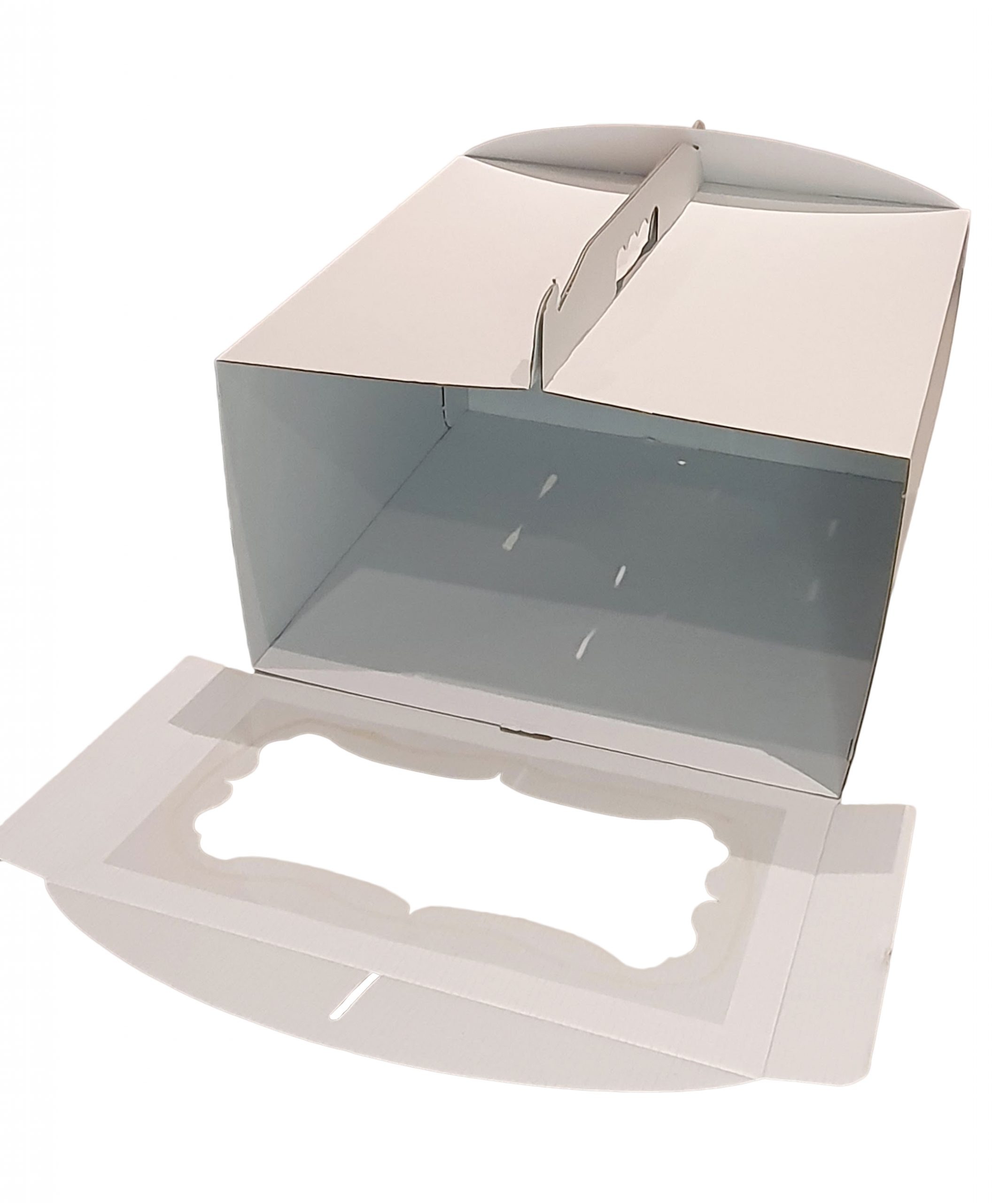 Caixa Cartão Pastelaria Branco c/Pega c/ Janela Vintage 34x34x20cm c/ Impressão
