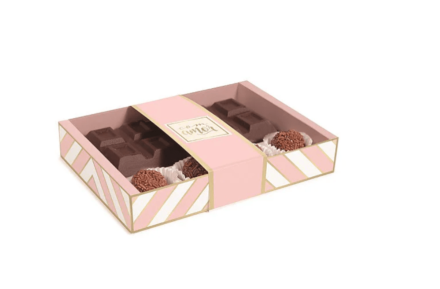 Início DIA DOS NAMORADOS Caixa Cartolina p/ Tablete Chocolate+Brigadeiros Chevron Rosa 18x13x3,2cm
