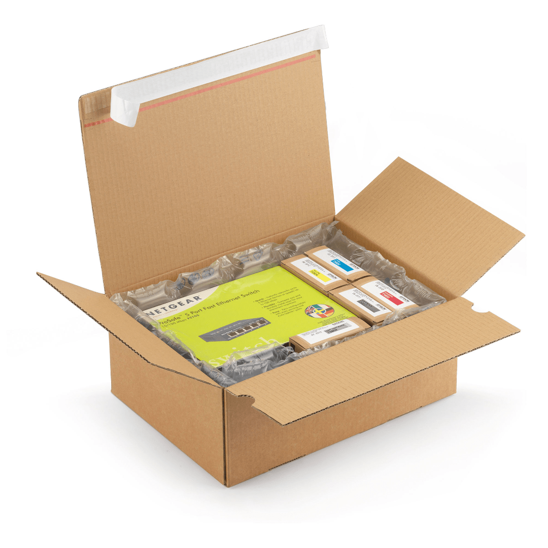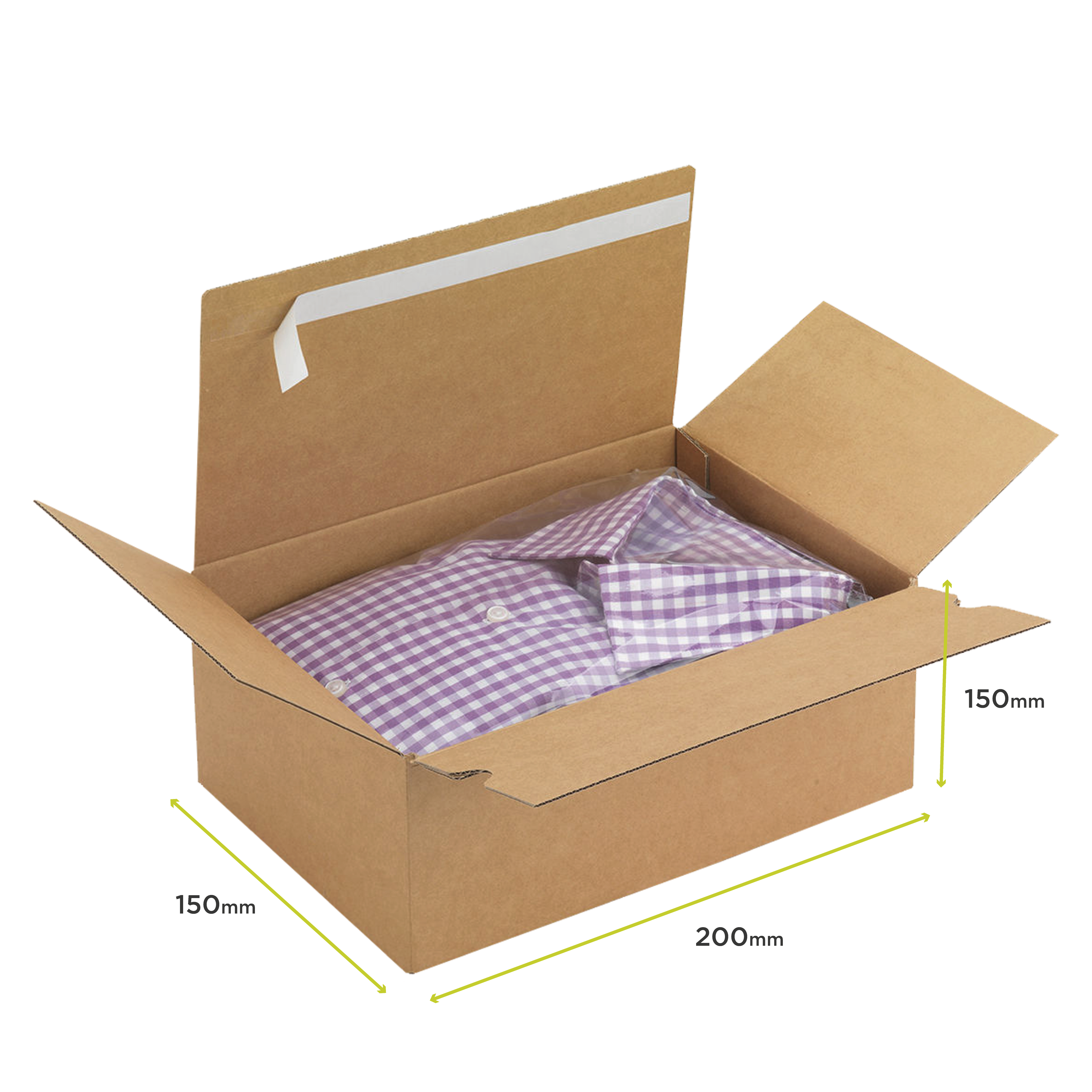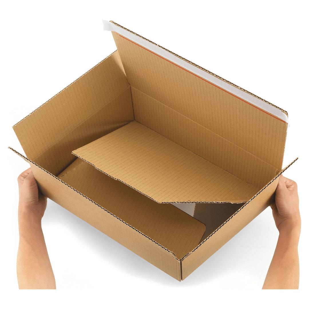 Caixa com fundo automático e fecho adesivo, fabricada em cartão canelado fino reciclável e folha exterior em papel kraft.