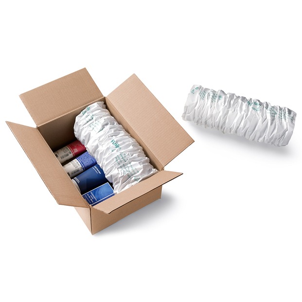 Somente uma pequena quantidade de almofadas de papel Paperplus®️ Chevron é necessária para preencher os espaços vazios numa embalagem.